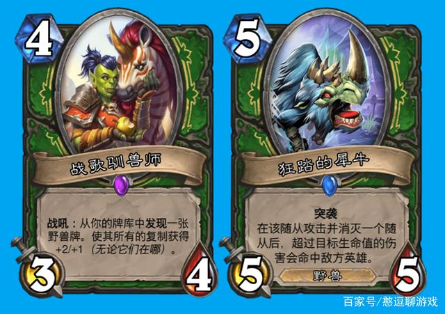 战歌驯兽师,人称犀牛召唤师,润滑型资源卡,大多数情况不会4费单下。都中后期了,一般是找犀牛斩杀,狂踏的犀牛加引月长弓这版本堪称死神,有火车王的风范了,暂时斩杀不了,给场上能动的鹿角小飞兔加buff也未尝不可。一般T7猎的牌库里也就只有这两头野兽,现在看见对面猎人出434就送掉杂毛下大墙成了基本操作。