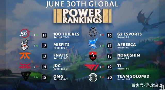 接下俩就是各个赛区排名中游的队伍了,比如说100T、JDG、G2、T1、TSM等。这些战队相信大家都已经非常熟悉,毕竟都是各个赛区的豪门,而且曾经在世界赛上展现自己的实力。这次夏季赛开始之后,这些队伍的表现也还不错。