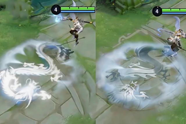 另外韩信的白龙吟这款皮肤也进行了调整,角下面的一个龙形印记变得更加清晰,以前的时候只有一个龙形态的轮廓看起来比较模糊,但是现在印记是非常明显的,尤其是龙头的位置,细节刻画非常明显,但是整体来看技能特效却比不上之前了,左侧是没有调整之前的,而右侧是调整之后的。
