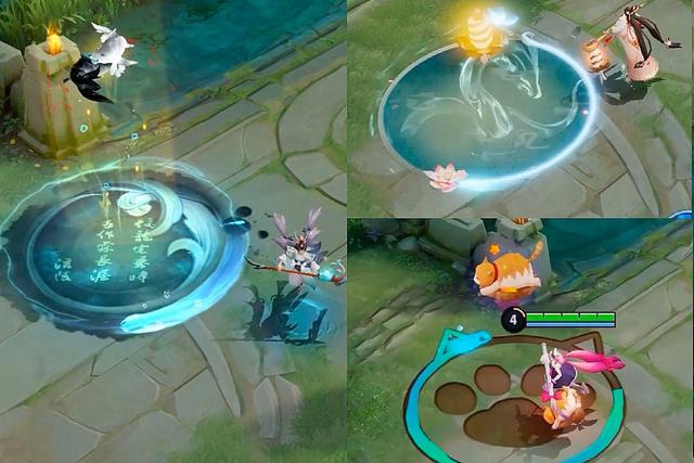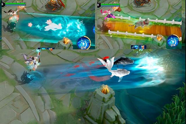 在三技能释放的时候,我觉得整体来看是白鹤梁神女这款皮肤的技能特效更好一些,主要原因就是猫狗日记和白蛇这两款皮肤的技能特效显得比较单调,一款皮肤只是落下莲花,猫狗日记落下类似于表情包之类的,而大乔的白鹤梁神女这款皮肤则是两条鱼儿跳来跳去,有一种鲤鱼跳龙门的感觉。