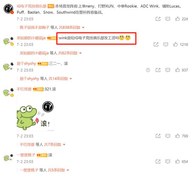 要知道,在IG对阵LGD的比赛中,IG首发下路双人组是Wink加Lucas,但Wink有着两波上头发挥,葬送了IG的好局。原本以为对阵LGD的比赛过后,Wink将会坐稳替补席,但IG却依旧让Wink在对阵FPX的比赛中首发上场,可以说是让人十分不解。与此同时,IG粉丝在得知首发阵容后,在官博底下疯狂吐槽,有粉丝调侃:Wink是给IG电子竞技俱乐部发工资吗?