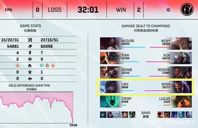 在IG和FPX的赛点局,LWX开局就陷入了巨大的劣势,之后的LWX也是一直被Wink给压制,而到了团战的时候,LWX也没有贡献多少输出数据,最后导致LWX打出了0比8的“超鬼”战绩,输出数据也不到一万。