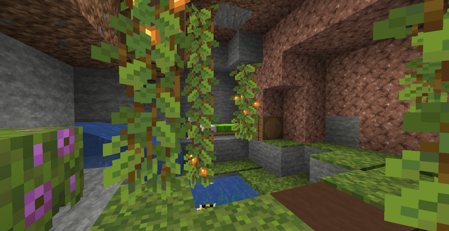 内饰的布置,可以选用苔藓作为底部装饰,这样能够让内部充满绿意,也符合洞穴本身的特征。其次,如果洞穴足够大,可以建造一个小水塘,说不定哪天有食物需求,也可以在小鱼塘当中获取到食物。此外,如果有一定条件,可以用发光浆果进行装饰,再搭配上孢子花,也许这样的组合更加趋向于完美与自然。加上一点点内饰,插上几根流淌着白色粒子的末地烛,放上两张床。此时此刻,身处这样的环境之中,略显几分惬意。如果居住的时间久了,也许会发现,这就像是童年所幻想的地方,说不定就“爷青回”了呢!