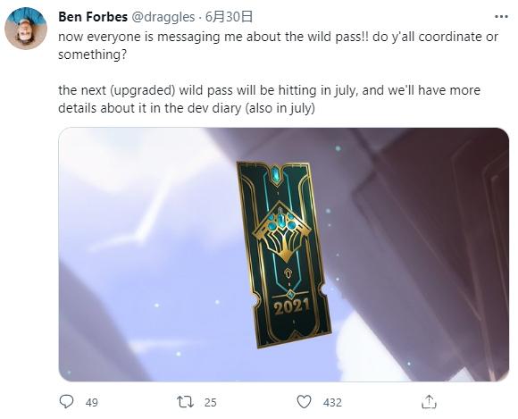 “现在每个人都在给我发信息说关于通行证的事!下一个升级版的通行证将在7月份发布,我们将在开发者日志(也在7月份)中详细介绍它。”