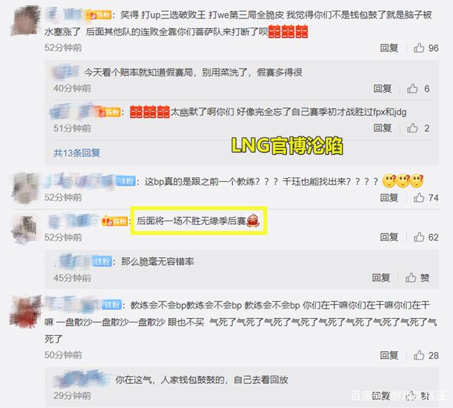 赛季初期LNG粉丝真的为自己主队感到自豪,几乎每个人都看好他们冲击第一的位置。但是赛季刚过半,输给RA、UP、WE惨遭三连败,LNG被扣上了“伪强队”的名号,给粉丝泼了一盆冷水。输给WE后LNG官博沦陷,粉丝都在质疑BP,和赛季初期相差太大,粉丝一句话扎心了:接下来我将一场不胜无缘季后赛!