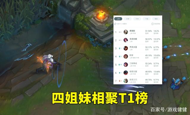 说到上单“四姐妹”我突然发现,自从刀妹上来以后她们四个就迎来了巅峰了,青钢影稳坐上单第一的称号,这个英雄的确很强,虽然被削弱了好几次,但机动性和真实伤害这两项让她们屹立不倒成为上单霸主,也是四姐妹的带头人,不管是对线、团战、单带青钢影都是可以完美胜任的。其次是剑姬,国服玩家最喜欢的上单英雄之一,作为“四姐妹”的老二,强度还行。