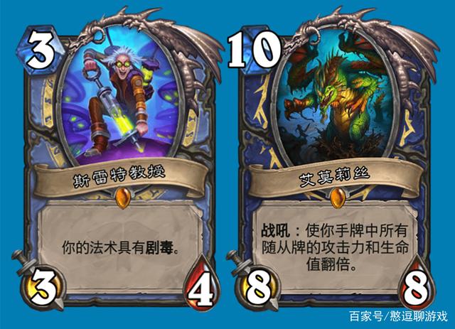 斯雷特教授,跟着谁都有用武之地,唯独给猎人与废物无异。且不说猎人死于解场的古语,猎人的AOE屈指可数,爆炸陷阱过于被动,可以被对面预防,爆炸射击不够超模还吃位置。艾莫莉丝,猎人的资源和过牌在十职业里排倒数。当然这卡在天梯也没什么用处,战吼萨都不一定会要。天梯带着不方便,竞技场发现衍生出来就好玩了,尤其是战士的龙吼。