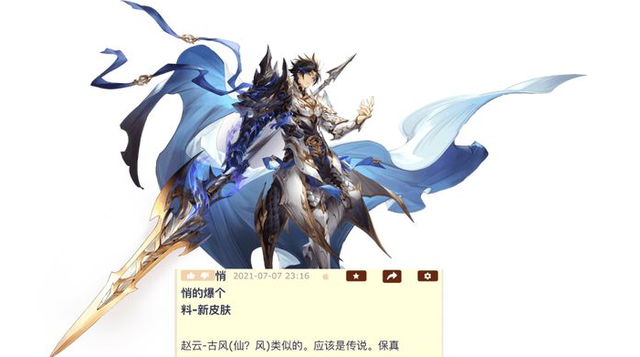 其实赵云还将会有一款传说皮肤,那就是已经在网上爆料的世冠皮肤。大家都知道世冠皮肤都是传说品质的,参考虞姬的云霓雀翎皮肤,也可以看出赵云的这款世冠皮肤必将会惊艳玩家。这款皮肤也将会是赵云的首款传说皮肤。
