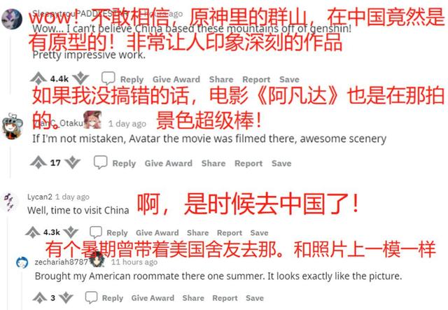 原神也跟张家界等风景区合作过,开放世界中,有一些地图是根据我们的名胜风景区设计的。当国外玩家发现这一情况时,又在国外激起了激烈的讨论,不少老外表示想要来旅游,还有一些旅游过的老外也在安利,表示这些风景区确实像原神游戏里这么美。