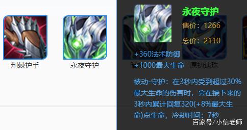 排名第二的永夜守护魔抗直接加了360点,同样也有1000点生命值加成,相比于魔女斗篷,被动触发条件要承伤超过30%获得回血效果,总体而言也还是可以的,是坦克比较适合的装备。