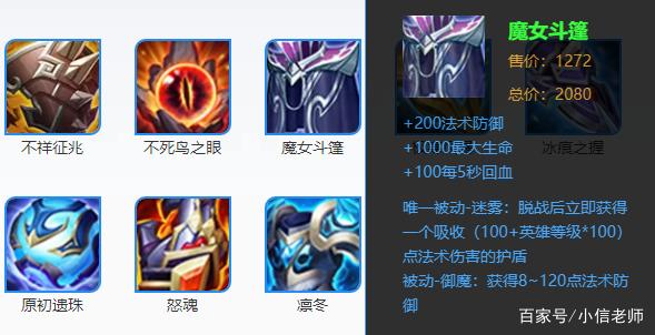 我们先来看魔抗装备的霸主——魔女斗篷,加200点魔抗,1000点生命值,外带回血效果,被动获得护盾和额外的魔抗,可以看到每一个属性加成都很硬核,主动有魔抗和坦度,被动不需要什么条件触发。