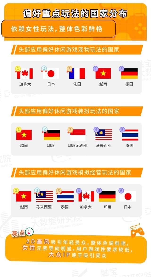 各国之间对玩法也有所偏爱,因此这类国家在重点玩法中也会有所偏好,从头部游戏中各种玩法的占比来看,宠物模拟玩法在发达市场较为通行,这类玩法中很容易与著名卡通 IP 融合,出现爆款, 2D 卡通仍然是移动游戏中最受欢迎的艺术风格,这类风格也吸引了年轻用户。装扮类玩法则很明显的出现了东南亚偏好的倾向,因为当地休闲类游戏的女用户占绝对优势,当地也会在游戏中添加部分更吸引与女性用户的元素。可以说,2D 卡通及相关 IP 以及女性偏好的鲜艳色彩,易上手以及陪伴感的元素都引起女性的兴趣。