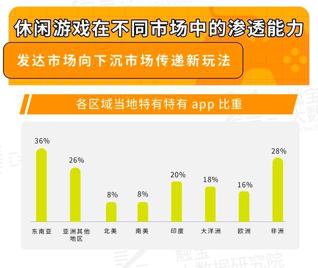 触宝大数据统计了各地区头部休闲类游戏中当地独有的游戏比例,发现欧美地区比例最低,只有 8%-16%。即美洲与欧洲审美与全球最为通行,当地的官方语言与游戏习惯由于文化输出世界其他地区也较为熟悉。习惯已经下沉到了其他地区,当地引领了游戏玩法的趋势潮流。当地的用户对新玩法和复合玩法的评价也会更高,可以更快速的迭代出合适版本。相比之下,非洲地区与东南亚地区的游戏有较多地域特征,他们的习惯与发达市场接轨较慢,也更容易受本土硬件和运营商的影响。