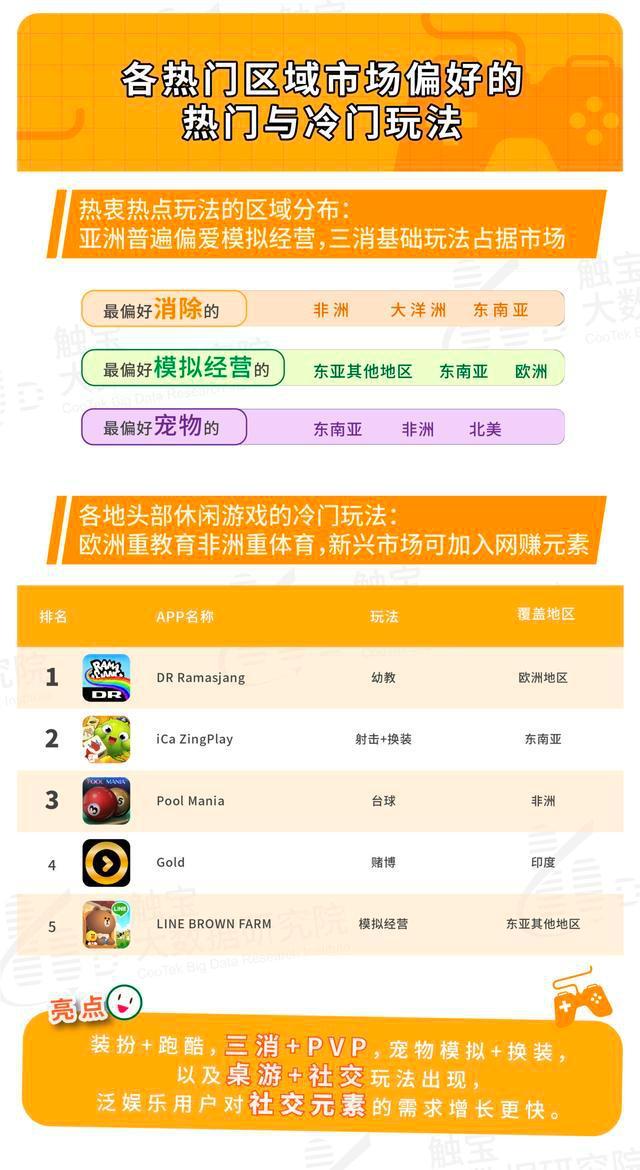各地随着市场发展都开拓出了更加复合型的玩法分层次吸引受众,其中装扮,经营等最容易与需要重复性操作的射击、消除等玩法进行结合,大部分成功爆款都与三消类玩法进行组合。地区的分布来看,亚洲地区普遍偏爱模拟经营类应用,欧美地区对多种复合社交类玩法都有很大的兴趣,新玩法可率先在当地推广,而在非洲地区目前还是以简单三消和基础宠物类玩法为主。女性深度玩法是在三消射击等基础上加入换装、经营、RPG 社交等元素,游戏性更强情感联结更紧密,休闲游戏的工具性质下降,加入更多社交元素,也是一个值得挖掘的市场,主要以欧美与东南亚地区为主。东南亚地区整体在玩法上更偏向于女性休闲类,致力于扩充女性市场,因为这类群体对游戏性要求不高,但对陪伴感,养成感和减压性需求较多,但相对来说能节省较多的成本,这类游戏在当地应有更大市场。各地区冷门玩法中主要与自己的当地特性进行结合,如对体育和网赚元素的热衷等等,女性相关的玩法元素仍是亮点。对于未来休闲游戏在当地进行推广投放时,也可以加入一定的视觉和玩法元素改造。