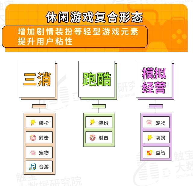 休闲游戏在发展过程中,用户习惯的玩法逐渐定型,包括三消类,模拟经营类,宠物互动类,装扮类等解压玩法,因此对开发者性价比较高的方式在已有热门玩法上进行尝试和改造。由于休闲游戏和超休闲游戏主要面向的玩家范围正在扩充,随着大量同质化换皮游戏出现,原有玩家逐渐出现审美疲劳。复合类玩法将经营、换装、模拟、消除,跑酷等等元素进行组合,重复性的玩法主要用于用户通关,解锁道具进行主线的关卡,一般主线关卡反而游戏性较弱,以装扮,角色扮演剧情为主,主要迎合女性用户群体。这类玩法增加了重复性玩法的游戏性,同时也提升了游戏的陪伴感。