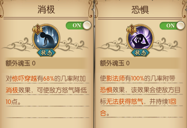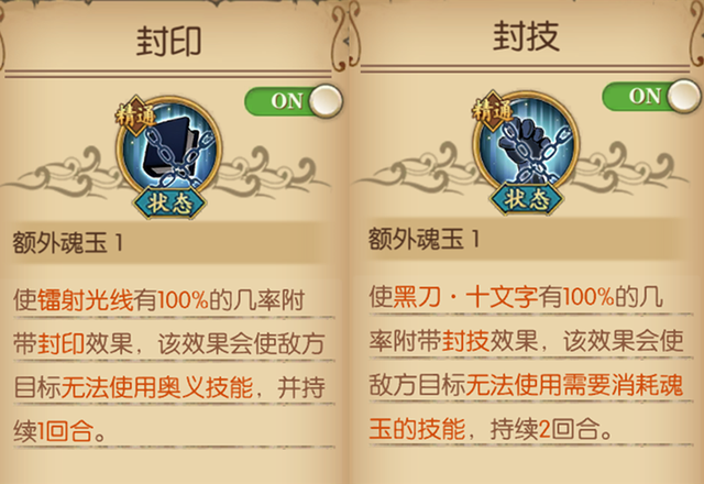 封印效果主要针对奥义,而封技效果主要针对有魂耗的技能。一般情况下这两个效果都是持续1回合的,但同样是新鹰眼,他的封技是2回合。