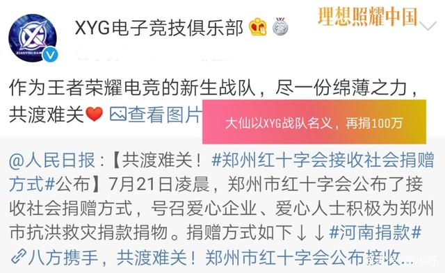 在大仙宣布完自己的捐款事宜之后,却有细心的粉丝发现一个问题,大仙捐赠的并不是100万,而是实实在在的200万,另外的100万是通过XYG战队的名义捐赠,但是大家应该清楚,XYG战队完全是大仙自己在运作,所以多捐赠的100万必然也是大仙自掏腰包。
