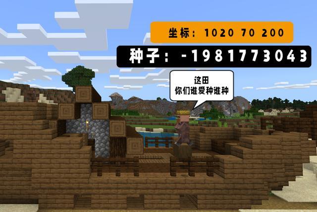 在该种子中,你将看到与民房结合的沉船,房子的主人刚好是一位农民。有趣的是沉船距离地面的高度已经超过3格,村民直接掉下去会受到摔落伤害,由于生物寻路算法会避开这种路径,所以村民将永久地被困于沉船之上,除非有外界因素进行干扰,比如玩家或者掠夺者的远程攻击。