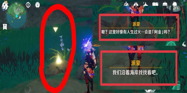 - 靠近闪光点,得知阿金曾经路过这里,提示我乙支织章们去海岸边找找看。