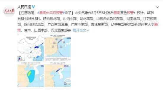 中央气象台8月5日06: 00发布黄色暴雨预警:据估计,8月5日08:00-06:00,陕西东北部、山西中部、河北南部、山东西北部和东部、河南北部、江苏东南部、四川西部盆地部分地区、广西西南沿海、广东中南部、吉林东南部、辽宁东部等地出现暴雨。其中山西中部和河北西南部有暴雨(以上部分地区伴有短期暴雨(最大时雨量30 ~ 50 mm,局部地区可超过70 mm),局部地区有雷雨大风等强对流天气。