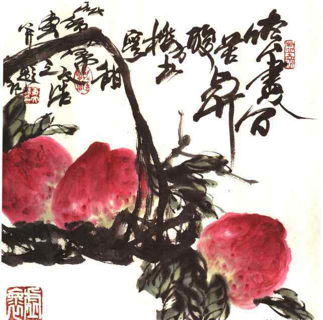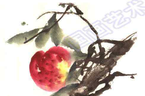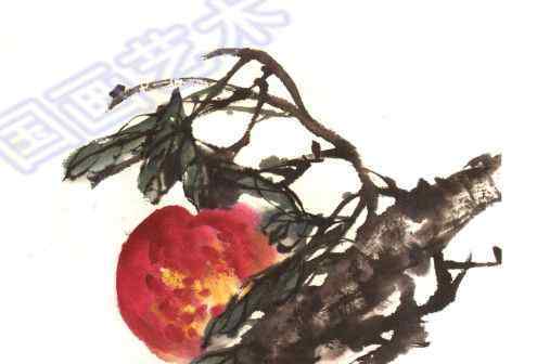 第六步:画桃子,然后画树枝。粗干部分用粗墨和淡墨画,中间和侧面。树枝通常是用浓墨或焦墨为中心画的。