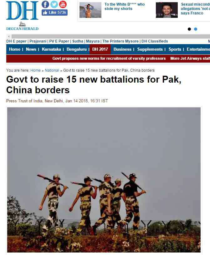 “印度政府计划在与中国和巴基斯坦的边界上增加15个营。”印度报业托拉斯1月14日报道称,这15个营将用于加强国家的两支重要边境守卫部队的力量,沿着同中国、巴基斯坦和孟加拉的战略边疆巩固国防。