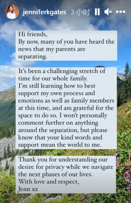 两人宣布离婚的消息震惊外界,他们的女儿珍妮弗‧盖兹在Instagram上写道,全家人已历经一段充满挑战的时光。“目前我仍在学习如何以最好的方式,来支持个人的过程和情感,还有自己的家人,我很感激能有空间这么做。”