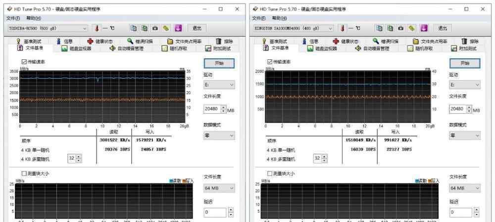 然后使用高清调谐软件测试这两个固态硬盘的SLC缓存大小。一开始试着写20G。东芝RC500和金士顿A1000可以保持测试读写速度,但从绝对读写值来说,东芝RC500性能更高,即读3000MB/s和写1570MB/s,而金士顿A1000会更弱,读只有1500MB/s,写只有990 MB。