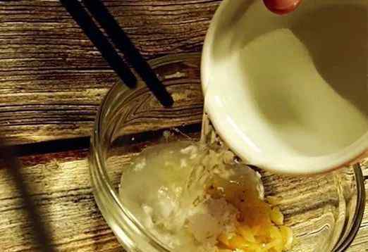 荷兰豆入锅前准备好调味汁。将大蒜、盐、糖和生粉放入碗中,用冷水将所有调料混合均匀。注意不要太稠,不然生粉在锅里容易结块。