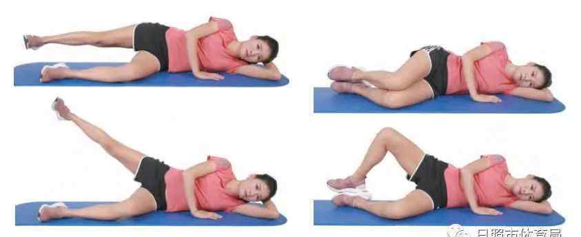 侧卧,臀部和膝盖弯曲约90度,臀部收缩,像贝壳一样张开大腿。跌倒时不要碰腿和膝盖,然后进行下一个动作。注意保持骨盆在中立位置,不要翻身。
