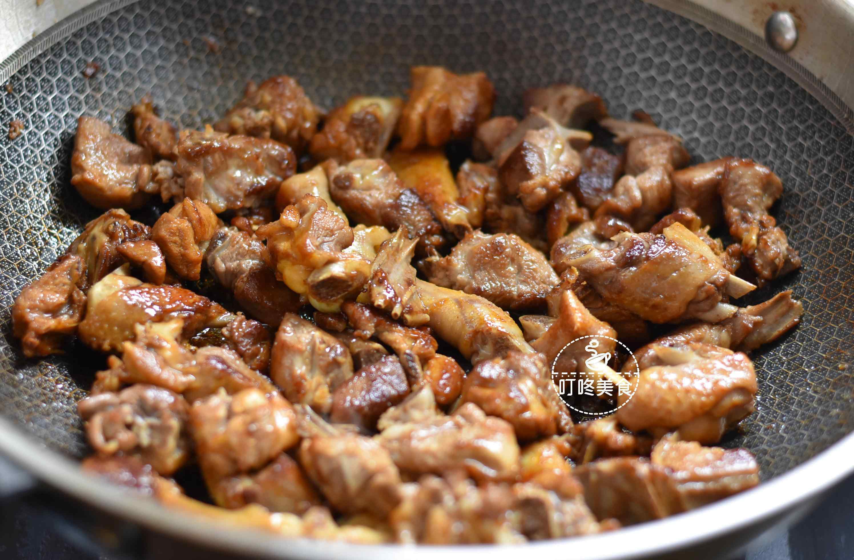 2.将两勺食用油放入锅中加热。倒入鸭子,翻炒。加入两块冰糖,将鸭子炒至表皮变黄。