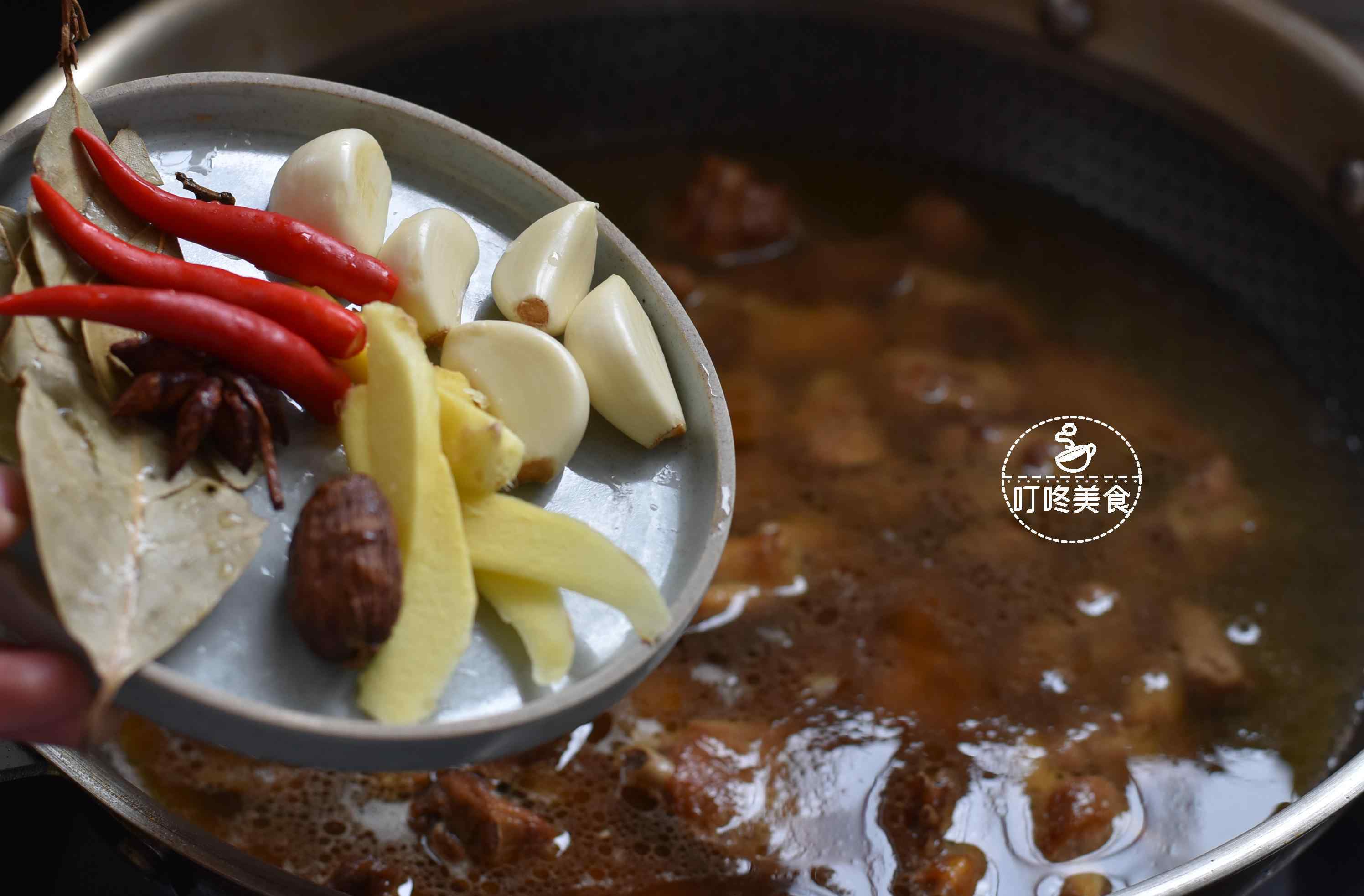 3.加入足够的水,倒入生姜、大蒜、八角、草果、香叶和小辣椒,煮沸。
