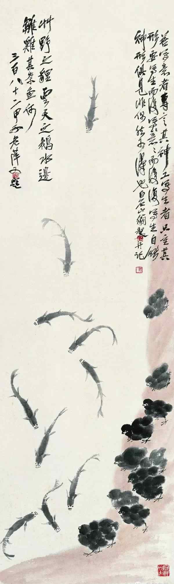 在著名的鱼画家中,“清代四僧”之一的八大山人风格独特,最具个性色彩。巴达·任山继承了陈淳、徐渭写意花鸟画的传统,发展成为一种大写意的绘画方法。他笔下的鱼、鸟、鹰、鹅、鸡、鸭,简单而夸张,怪诞。特别是鸟和鱼的眼睛被画成“白眼睛”。所谓“失势的伤心鸟,默默盯着鱼”造就了前所未有的鱼鸟造型,在构图上,常常让人觉得突兀、诡异。例如,一幅画的中心只画了一条鱼、一只鸭子和一只鸟。这样的构图对大多数人来说是禁忌,但八大山人却敢肆无忌惮地这样做。据统计,他的画中大约有50幅只有一种动物的画。