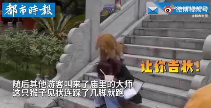 5月26日,贵州贵阳,一女游客给一只猴子橘子吃,不料猴子将其丢掉并不断欺负游客。随后其他游客叫来了庙里的大师,这只猴子见状连踩了几脚就跑。网友调侃:这泼猴怕师傅来念紧箍咒吧!