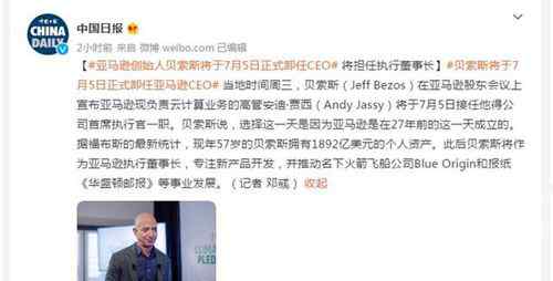 2.《贝索斯将于7月5日卸任亚马逊CEO 此后将作为执行董事长专注新产品开发 具体是啥情况?》仅供读者参考,本网站未对该内容进行证实,对其原创性、真实性、完整性、及时性不作任何保证。