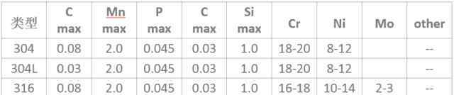 不锈钢:耐空气体、蒸汽、水等弱腐蚀性介质或不锈钢。常用的钢有304、304L、316和316L,是奥氏体不锈钢的300系列钢。