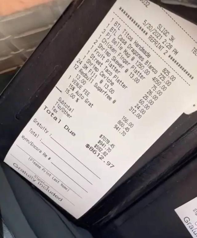 无独有偶,本月早些时候,美国拉斯维加斯一名男子分享了自己在阵亡烈士纪念日期间,花在酒吧里的巨额账单。当时,这么男子收到了8613美元(约5.5万人民币)的账单,包括一瓶825美元(约5300元人民币)的蒂托手工伏特加,三瓶1350美元(约8600元人民币)的皮埃尔之花贝尔香槟,以及一份75美元(约450元人民币)的鸡翅拼盘。这名男子在网上写道:“在安可海滩俱乐部参加了一天的派对后,我的朋友们就用了这个标签……被压抑的需求非常非常真实,拉斯维加斯又回来了。”