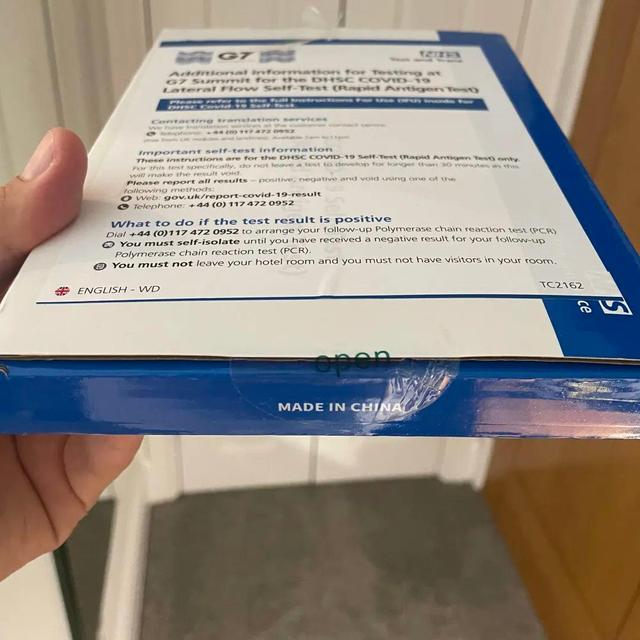从图中内容来看,照片拍摄者拿着一份状似文件袋的东西,贴在外包装的纸上印有G7峰会和英国国民医疗服务体系(NHS)的标志,标题写着“Additional information for Testing at G7 Summit for the DHSC COVID-19 Lateral Flow Self-Test (Rapid Antigen Test)”(有关在G7峰会进行DHSC(卫生及社会关怀部)新冠侧流式自我检测(快速抗原检测)的更多信息),下面则是一些注意事项和相关部门的联系方式。