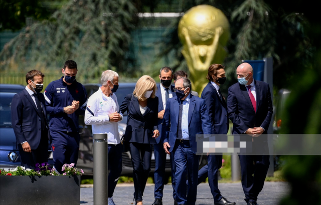 当其他第一夫人们纷纷提前抵达英国的时候,当地时间6月10日,布丽吉特和马克龙以情侣装亮相,会见了法国足协主席和国际足联主席。布丽吉特的这身蓝色西装太凸显气质了,白色内搭也是点睛之笔,蓝白造型和马克龙呼应起来,真是甜蜜到极致了。