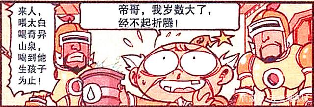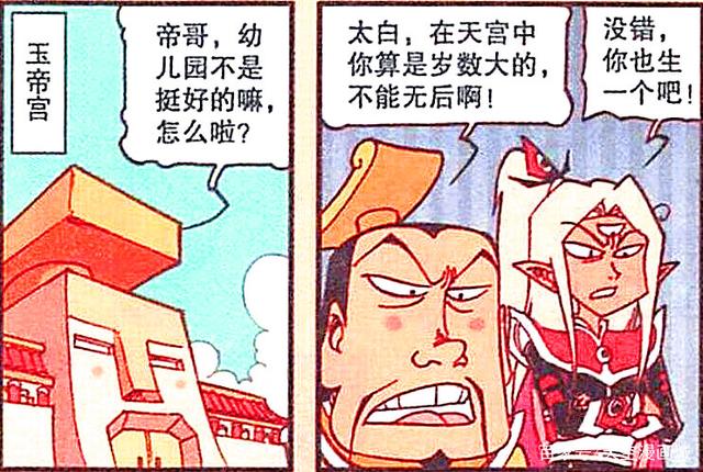 太白老仙是非常精明的人,他利用女儿国的河水让天宫神仙生下孩子,然后就开始着手修建天宫唯一的“幼稚园”,如此一来神仙们的孩子也只能到他这里上学,而且他收的学费也非常昂贵,无论谁有意见都太白都不会理睬,如此“一言堂”的行为在帝哥看来都是太白老仙的阴谋,于是在身体恢复了之后他决定好好的制裁一下太白,让他也体验一下生孩子的痛苦。而太白终究是胳膊拧不过大腿,在帝哥的强迫之下生一子,并且还得了产后抑郁症,真是恶人自有恶人磨,害人终害己。