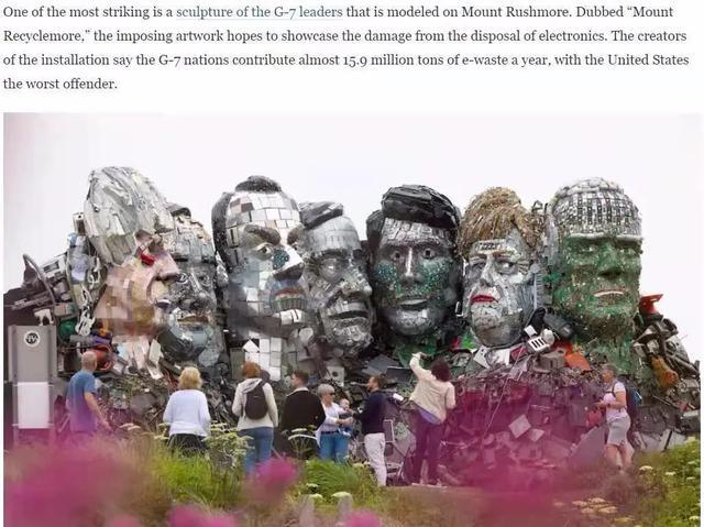 游客们正在看由电子垃圾制作的“回收山” 《华盛顿邮报》报道截图
