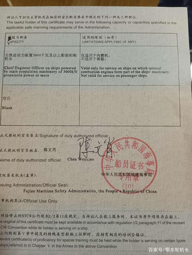 海船船员证书于是船长将这一情况立即报告给船公司,从公司得到这一情况之后也是急得跳脚。于是紧急安排一位轮机长从中国飞往美国准备上船替代,还好替代的轮机长持有美国签证以及其他的证书都在有效期内。就在船公司告诉船上接替的轮机长已经坐上从中国飞往美国的飞机的时候,三负居然在自己房间沙发的缝隙里面找到了船上轮机长中国签发的轮机长适任证书。