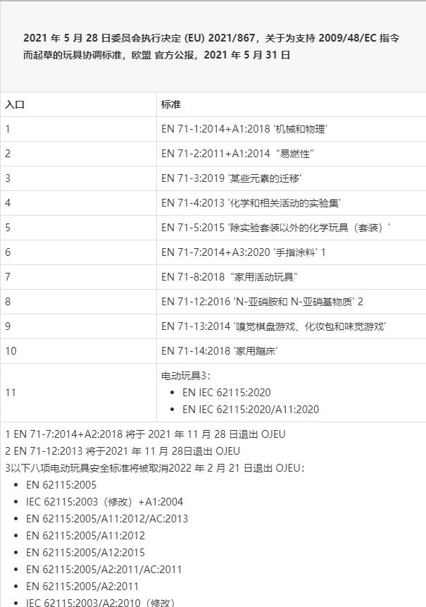 2021 年 5 月 31 日,欧盟 (EU) 发布了实施决定 (EU) 2021/867,其中包含推定符合指令 2009/48/EC(玩具安全指令,TSD –合并版本)的最新玩具安全标准清单。2021 年 5 月)。这套最新的标准包含几个重要的规定: