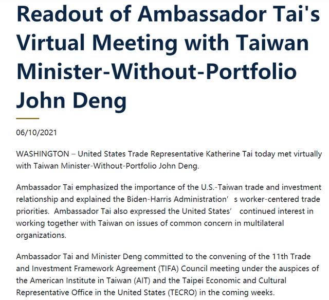 6月10日,美国贸易谈判代表戴琪与台湾当局经贸谈判代表邓振中进行视频会议,双方确认数周内将举行第11届台美贸易暨投资架构协定会议(TIFA)。
