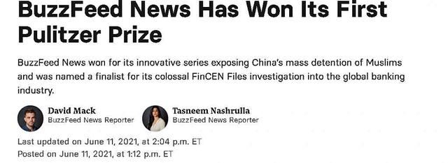 BuzzFeed获得普利策奖但是,今年的普利策奖,却打了自己的脸。美国 Buzzfeed 新闻网,就因为去年“撰写的一组抹黑新疆的系列报道”,获得了美国新闻界最高荣誉的 " 普利策奖 "。没错,就是靠造谣和虚假的新闻,他们“首次”获得了这个“新闻诺贝尔奖”。