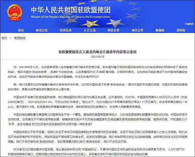 总结下来,北约这份联合报告就是关于中国的“威胁论”,也已经算是老调重弹了,对此中国驻欧盟使团也立即怼了回去。中国使团发言人首先指出北约这份报告是对中国和平发展的诋毁,中国从来都没有对谁形成“系统性挑战”,同时发言人还警告北约欠着南联盟大使馆血债,中国永远不会忘记,最后发言人要求北约理性看待中国发展。
