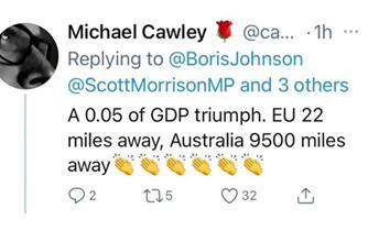 “(只带来)0.05%的GDP增长。欧盟就离22英里远。澳大利亚9500英里远。鼓掌!”↓
