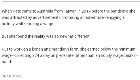 来自新州工会的莫雷(Mark Morey)表示,在许多低薪的例子中,移民工人工资按件计数(根据篮筐里采摘的水果量),而不是按照时薪。除此之外,一些雇主还向工人收取食宿费。“在我们的边远和乡村地区正在发生的事情真的非常吓人。这些移民工人和年轻澳人正被剥削,必须阻止。”