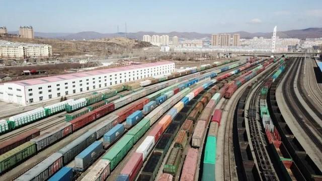 这是3月31日拍摄的绥芬河站南场,中欧班列从这里出入境(无人机照片)。新华社记者王建威摄