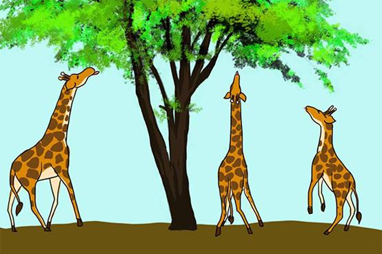 这要从长颈鹿的脖子说起。长颈鹿的祖先身高并不高,主要生活在非洲东部,以食草为生。随着地球生态环境和气候的变化,地上的食物资源变得越来越匮乏,低矮植物上的叶子也变得越来越稀少。于是长颈鹿转而食用高大植物上的叶子。在食用的过程中,长颈鹿只有尽力将脖子伸长,才能够到树梢上的嫩叶。久而久之,一部分长颈鹿的脖子变得越来越长,它们因为能够采食到足够多的树叶而存活了下来,继续将“长脖子”传给下一代。而另一部分“不高”的长颈鹿因脖子短够不到食物,自然而然就被淘汰掉了。
